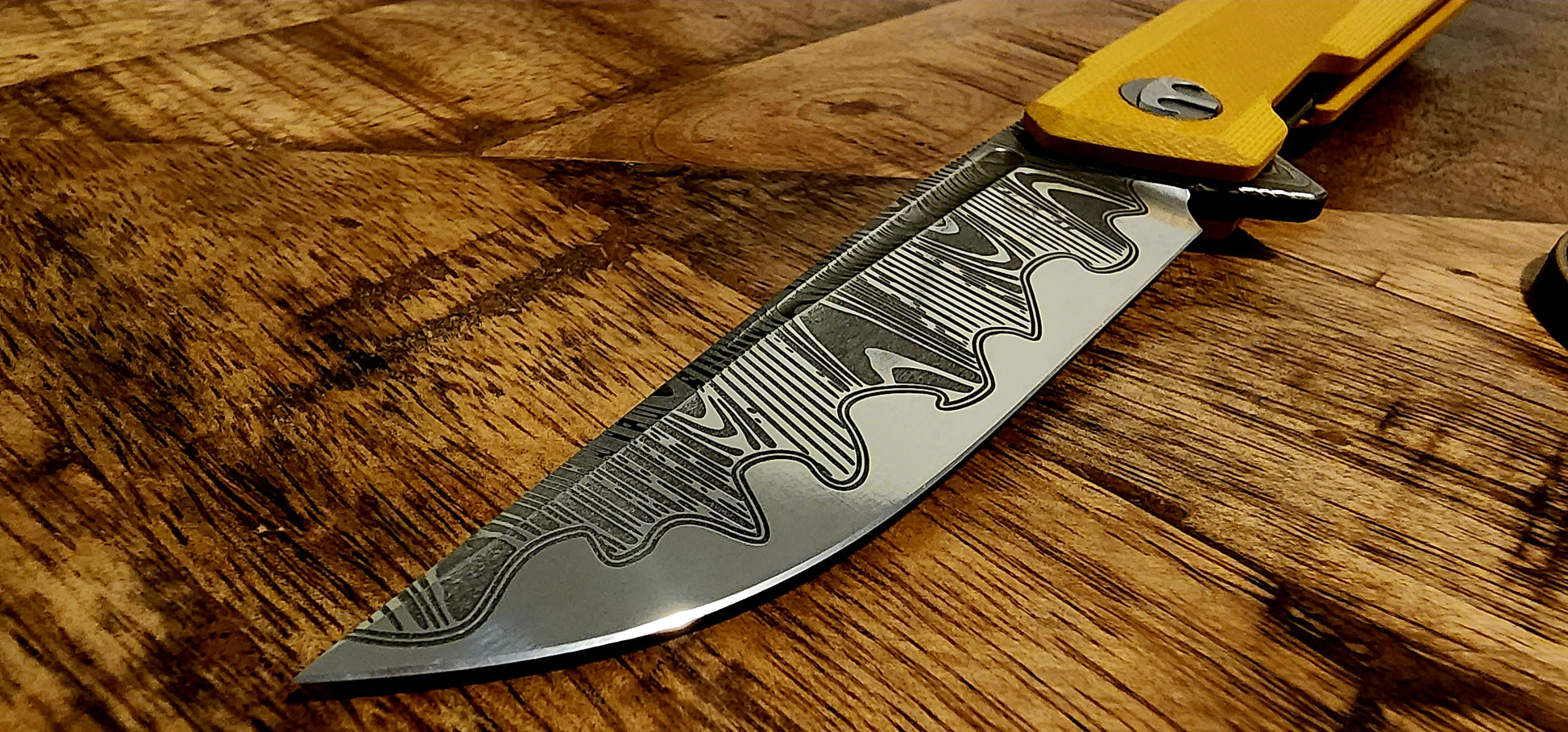 **This item is customized by TS Custom, the owner of this site, and is NOT a factory option. The handle is pressure-dyed Sunset yellow. The blade and clip, are polished, and pattern engraved with an acid-etched process, adding a deep ladder Damascus pattern.**