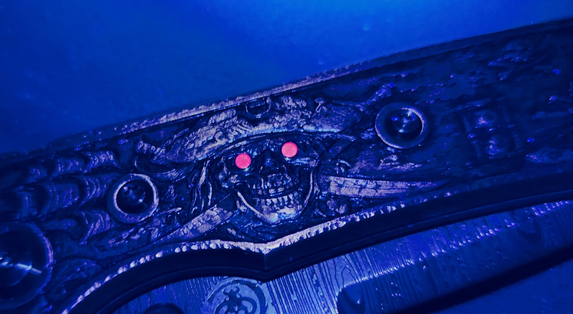 - Real rubies in 18k bezels where inset into the skulls eyes, on both sides of the knife handle.