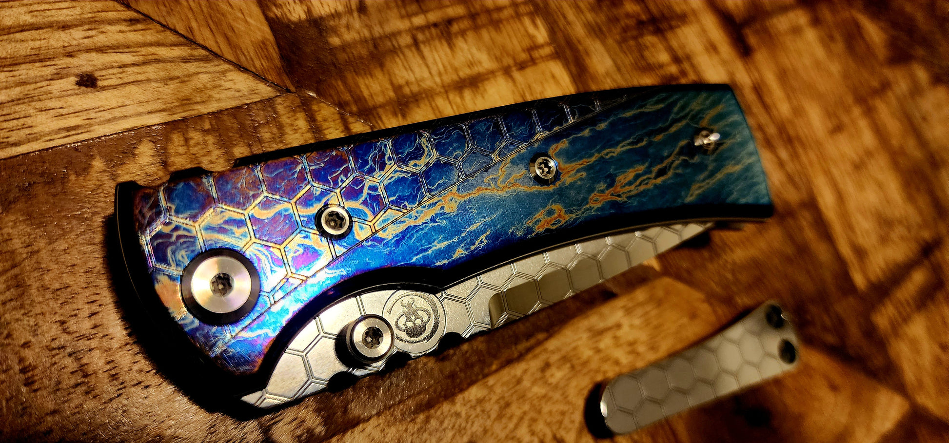 - Solid titanium scales added. The scales are Chaves OEM. (The original Micarta scales are included under the foam insert.)
