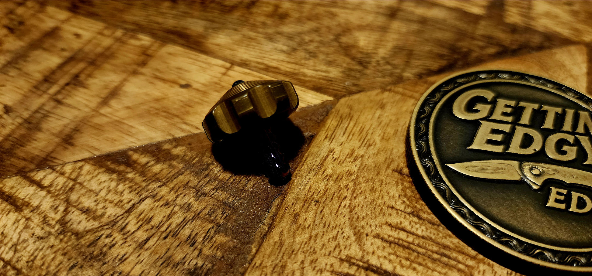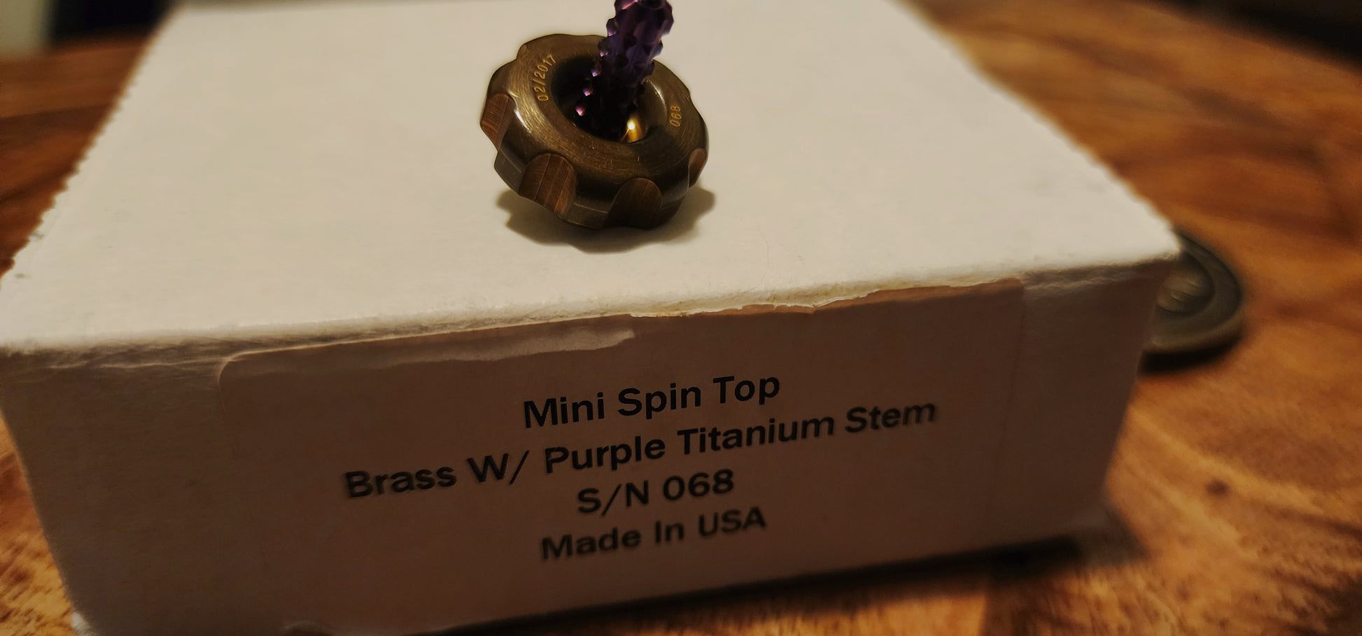Mini spin top / desk toy (collector accessory), often serial/date numbered and matched to its box.
