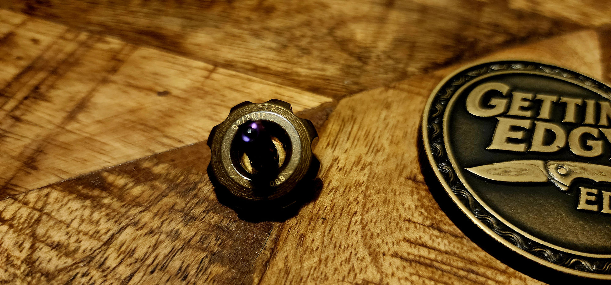 Microtech / Marfione “Mini Spin Top” (purple titanium) is a small desktop spinning top made by Marfione Custom Knives / Microtech, two-piece design (body + removable stem/shaft). Purple anodized titanium stem, with brass body.